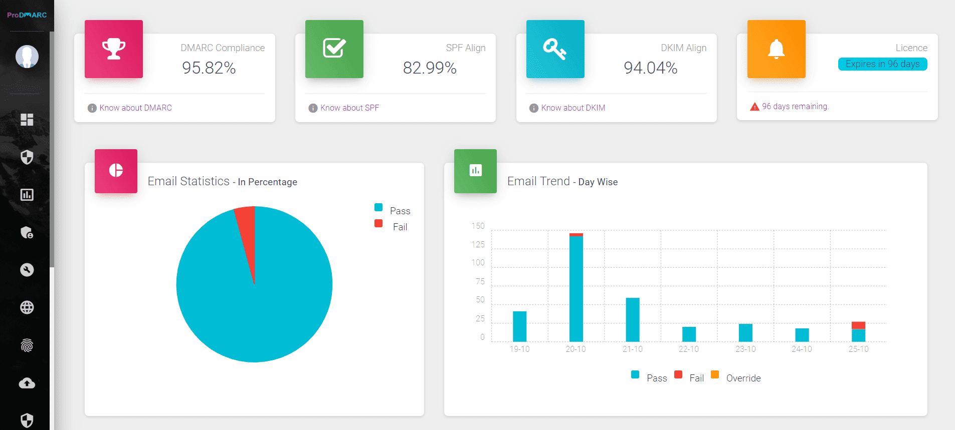 What do you like best about ProDMARC? Consolidated ProDMARC Reports including Compliance and Weekly Failure Reports without What do you dislike about ProDMARC? Deep analysis of forensic report RUF is required. What problems is ProDMARC solving and how is that benefiting you? 1. It enables DMARC enforcement and reject spoofed emails. 2. Helps in providing centralized dashboard. 3. Monitoring of emails on behalf of us. 4. Helps in compliance checks and notifying if mails are getting delivered/passed/failed through either SPF or DKIM.